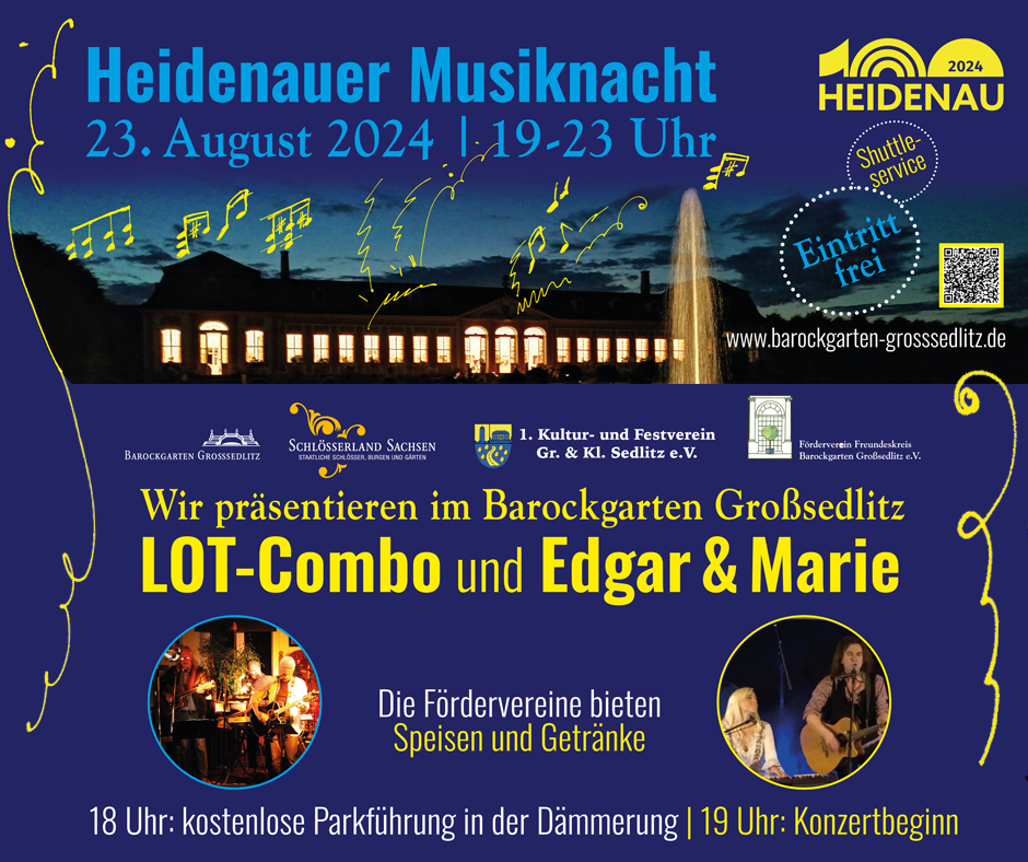 Der Freundeskreis Barockgarten e.V und wir, der 1. Kultur- und Festverein Gr. & Kl. Sedlitz e.V. bedanken uns ausdrücklich bei den über 700 Besuchern unseres Beitrags zur Heidenauer Musiknacht 2024. Sowohl die Musiker als auch die dargebotenen Speisen und Getränke kamen bei den Gästen sehr gut an. Diese erste Zusammenarbeit [weiterlesen]