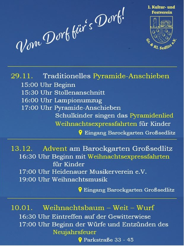 Ab 15:00 Uhr erwartet die Gäste vor dem Eingangstor am Barockgarten ein stimmungsvolles Programm: Festliche Stände mit weihnachtlichen Leckereien, Glühwein und großer Stollenanschnitt, der Weihnachtsexpress fährt und ein Lampionumzug für die Kinder ist organisiert. Höhepunkt des Abends ist das feierliche Anschieben der Großsedlitzer Pyramide und das gemeinsame Singen des Pyramidenliedes – ein Brauch, der Jahr für Jahr zahlreiche Besucher in die Ortschaft lockt.